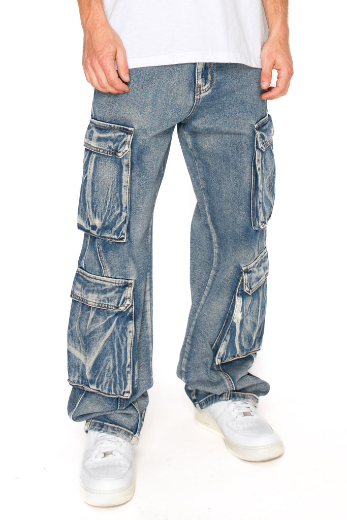 These baggy jeans are finished in washed denim and stacked with oversized double cargo pockets on each leg. The wide fit and reinforced construction make them both durable and standout for everyday wear.