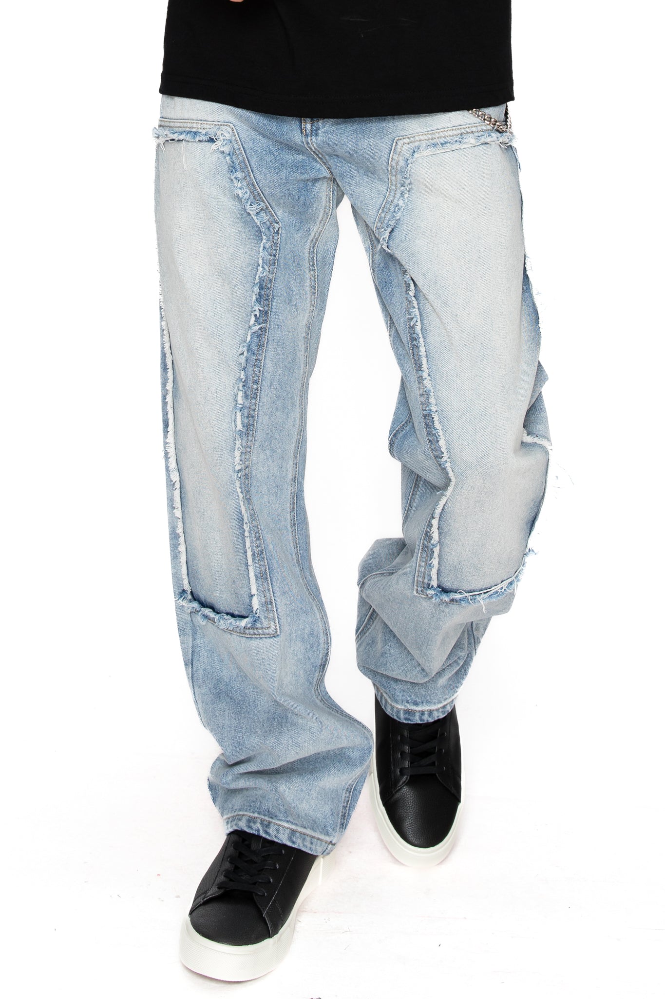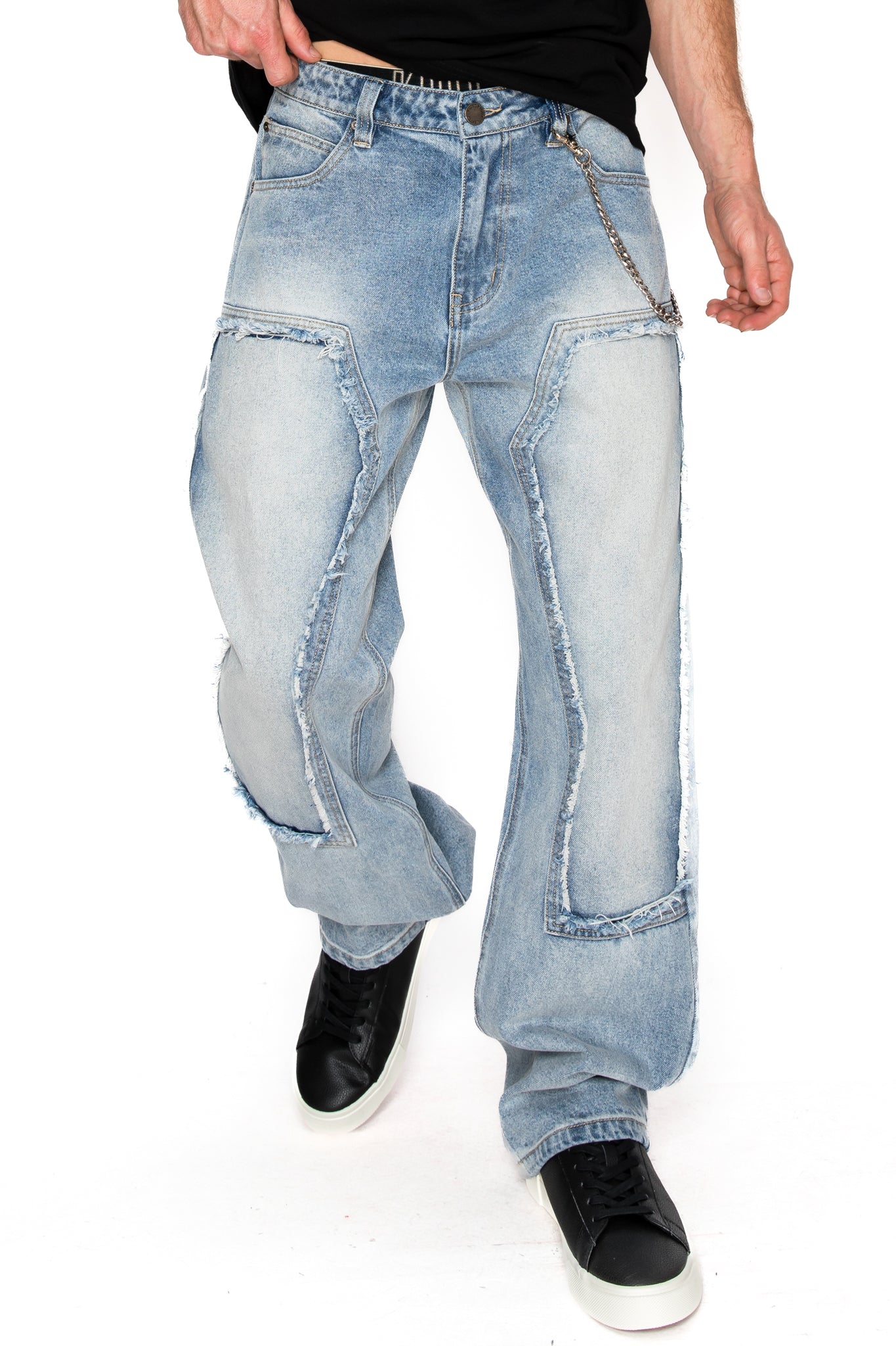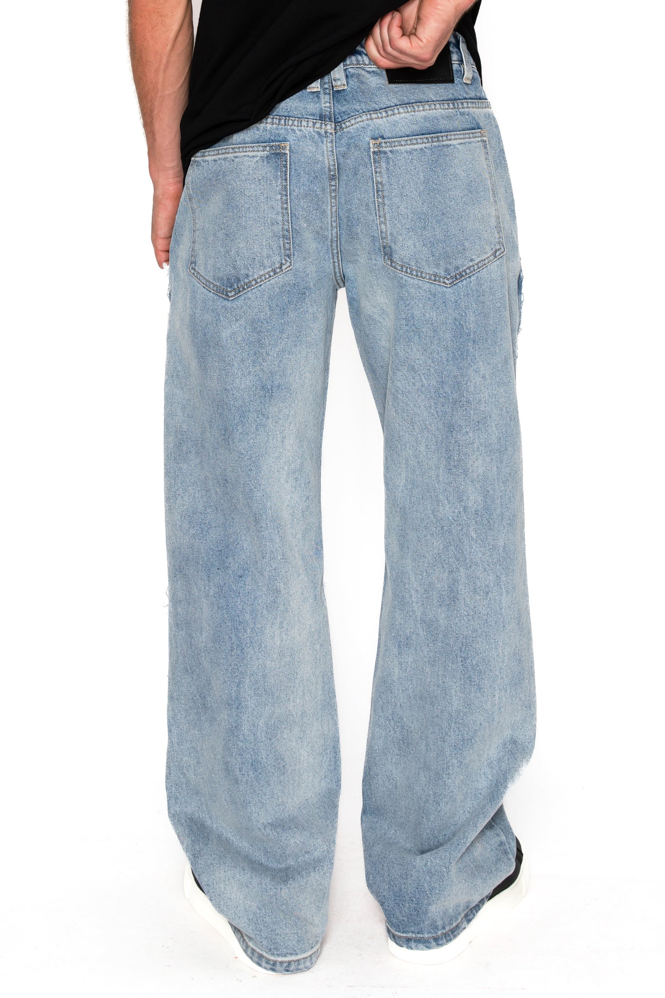 Baggy fit denim jeans featuring a unique double knee panel design with distressed edges for a bold, reconstructed look. Crafted from 13 oz heavyweight 100% cotton denim. Designed with a relaxed wide-leg silhouette and clean back pocket finish for everyday wear.