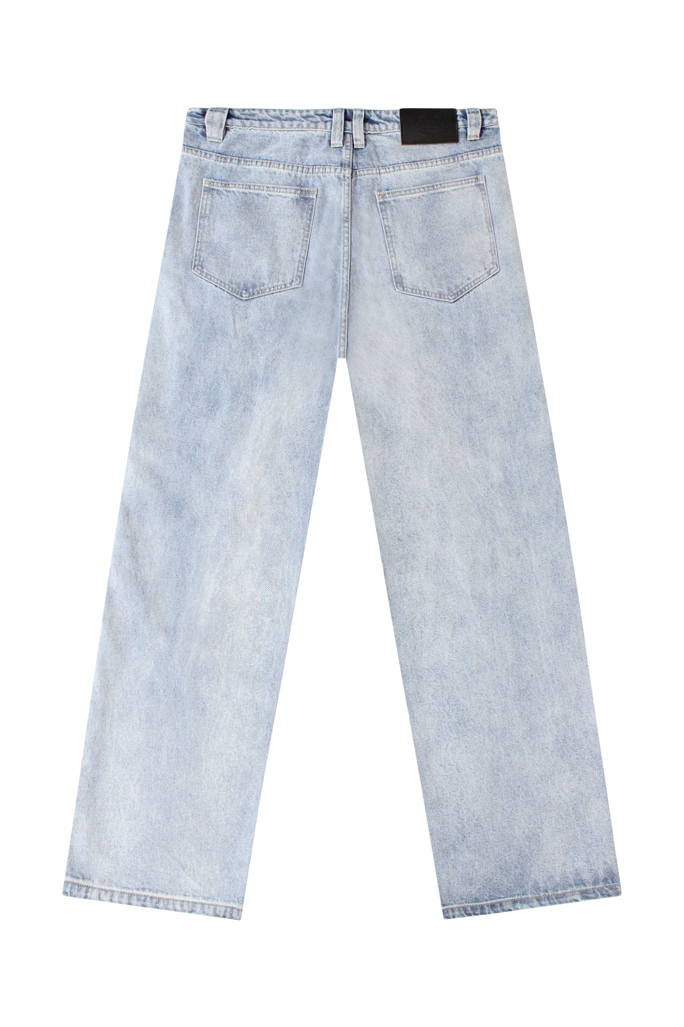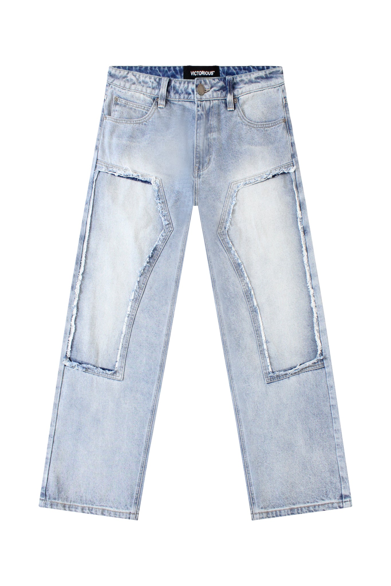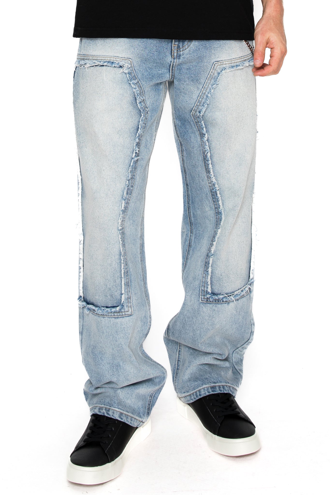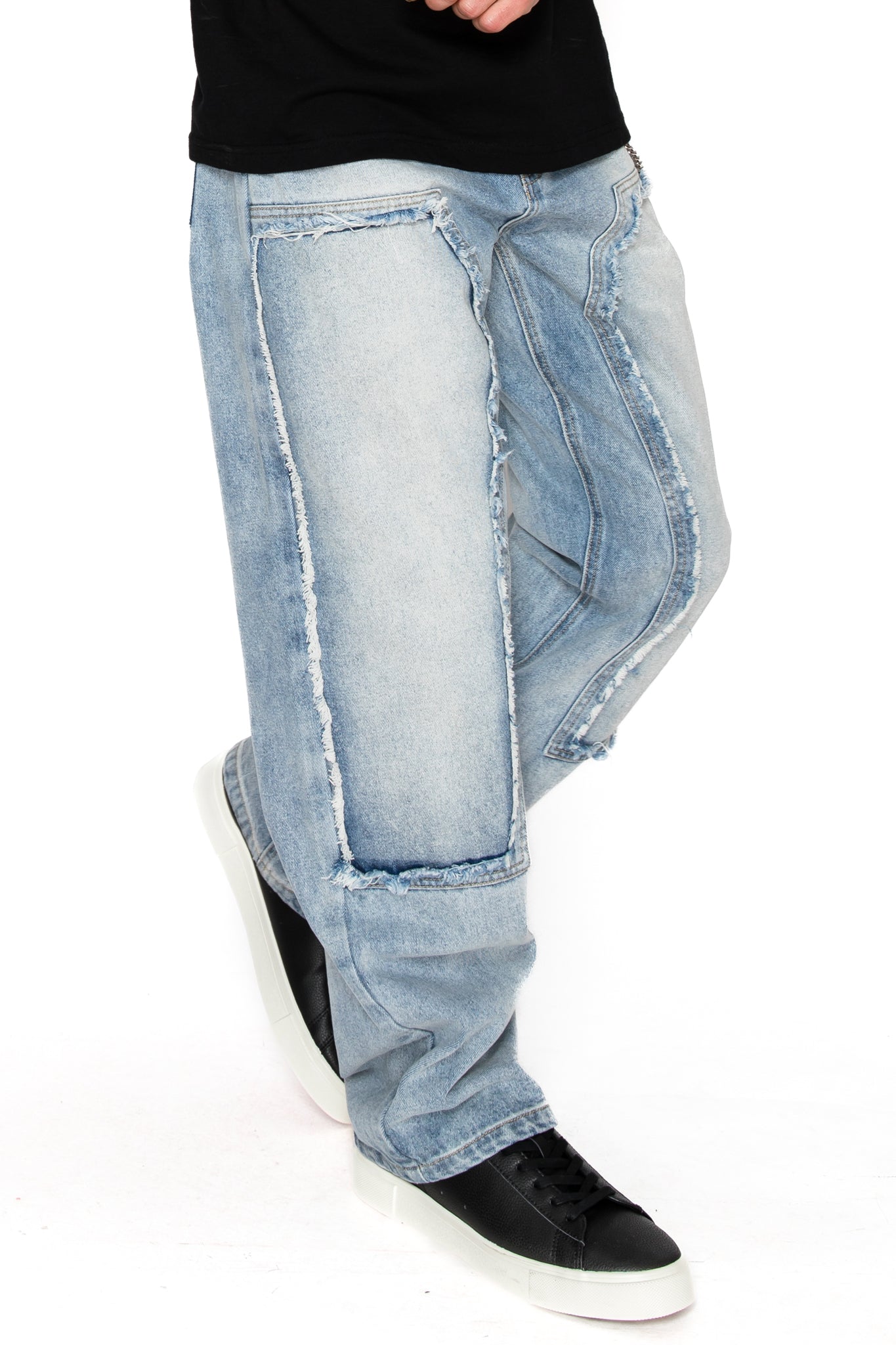 Baggy fit denim jeans featuring a unique double knee panel design with distressed edges for a bold, reconstructed look. Crafted from 13 oz heavyweight 100% cotton denim. Designed with a relaxed wide-leg silhouette and clean back pocket finish for everyday wear.